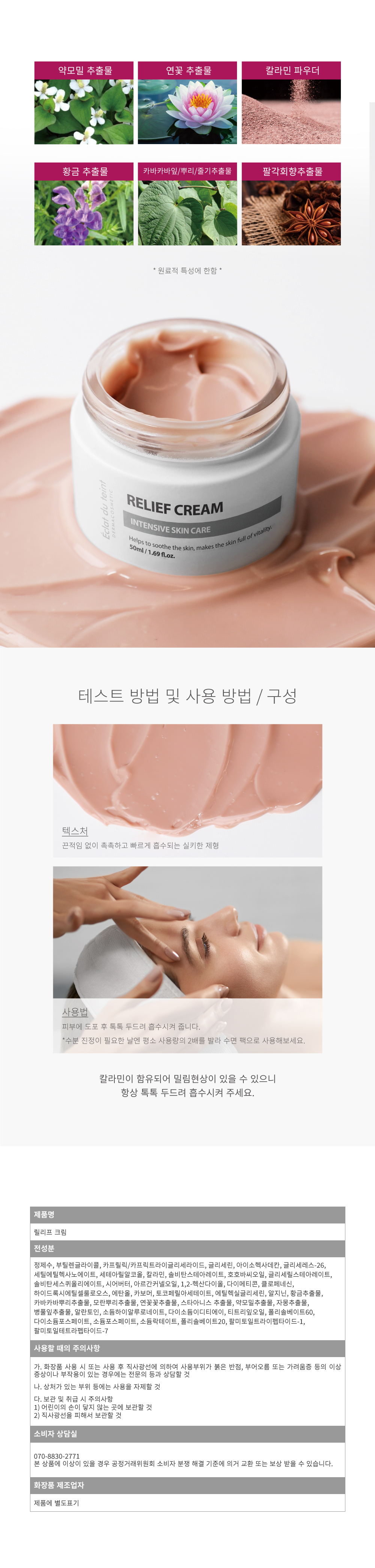 정제수, 부틸렌글라이콜, 카프릴릭/카프릭트라이글리세라이드, 글리세린, 아이소헥사데칸, 글리세레스-26, 세틸에틸헥사노에이트, 세테아릴알코올, 칼라민, 솔비탄스테아레이트, 호호바씨오일, 글리세릴스테아레이트, 솔비탄세스퀴올리에이트, 시어버터, 아르간커넬오일, 1,2-헥산다이올, 다이메티콘, 클로페네신, 하이드록시에틸셀룰로오스, 에탄올, 카보머, 토코페릴아세테이트, 에틸헥실글리세린, 알지닌, 황금추출물, 카바카바뿌리추출물, 모란뿌리추출물, 연꽃꽃추출물, 스타아니스추출물, 약모밀추출물, 자몽추출물, 병풀잎추출물, 알란토인, 소듐하이알루로네이트, 다이소듐이디티에이, 티트리잎오일, 폴리솔베이트60, 다이소듐포스페이트, 소듐포스페이트, 소듐락테이트, 폴리솔베이트20, 팔미토일트라이펩타이드-1, 팔미토일테트라펩타이드-7