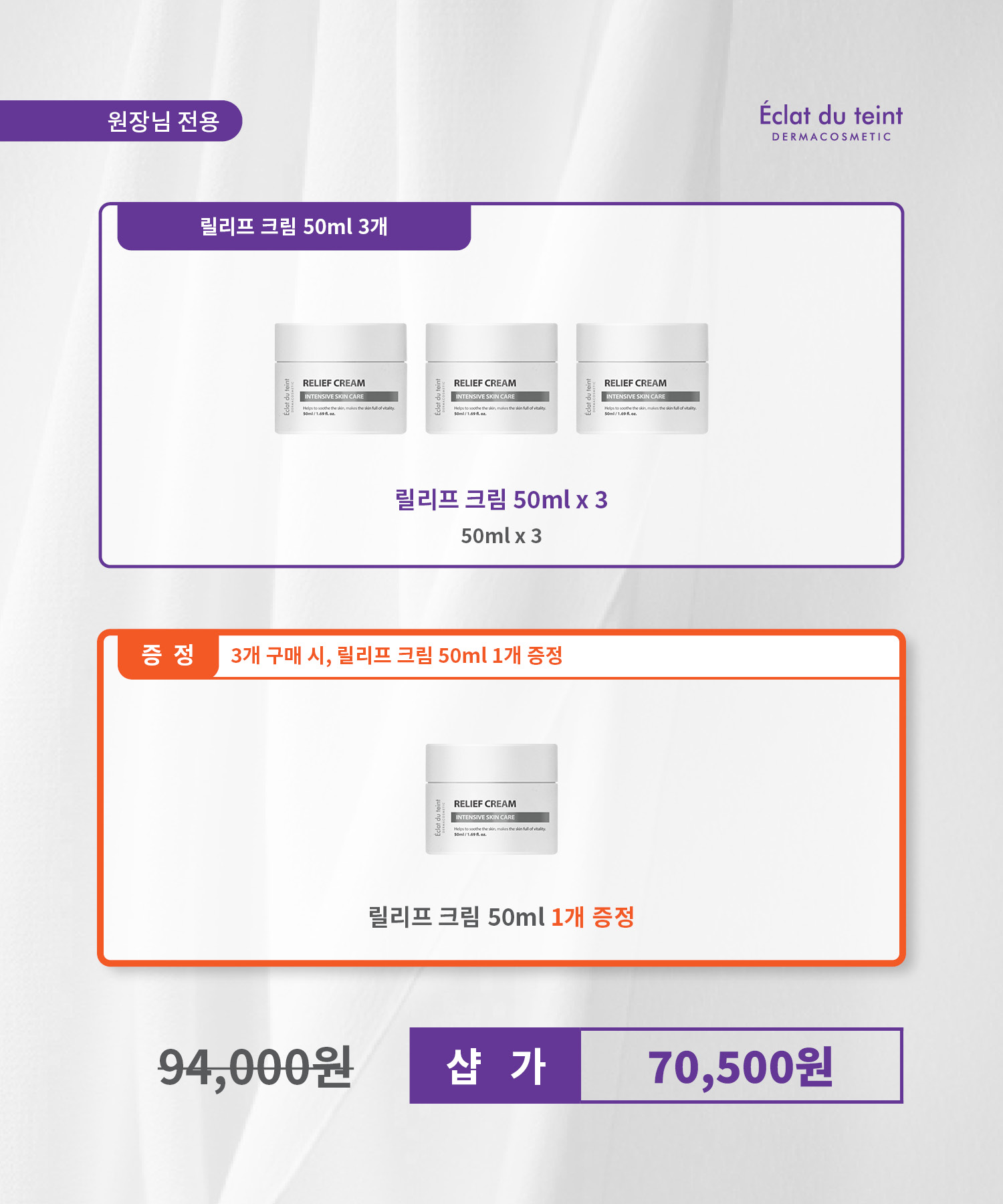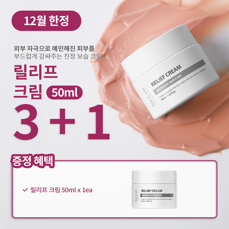 [릴리프 크림] 전성분 정제수, 부틸렌글라이콜, 카프릴릭/카프릭트라이글리세라이드, 글리세린, 아이소헥사데칸, 글리세레스-26, 세틸에틸헥사노에이트, 세테아릴알코올, 칼라민, 솔비탄스테아레이트, 호호바씨오일, 글리세릴스테아레이트, 솔비탄세스퀴올리에이트, 시어버터, 아르간커넬오일, 1,2-헥산다이올, 다이메티콘, 클로페네신, 하이드록시에틸셀룰로오스, 에탄올, 카보머, 토코페릴아세테이트, 에틸헥실글리세린, 알지닌, 황금추출물, 카바카바뿌리추출물, 모란뿌리추출물, 연꽃꽃추출물, 스타아니스추출물, 약모밀추출물, 자몽추출물, 병풀잎추출물, 알란토인, 소듐하이알루로네이트, 다이소듐이디티에이, 티트리잎오일, 폴리솔베이트60, 다이소듐포스페이트, 소듐포스페이트, 소듐락테이트, 폴리솔베이트20, 팔미토일트라이펩타이드-1, 팔미토일테트라펩타이드-7