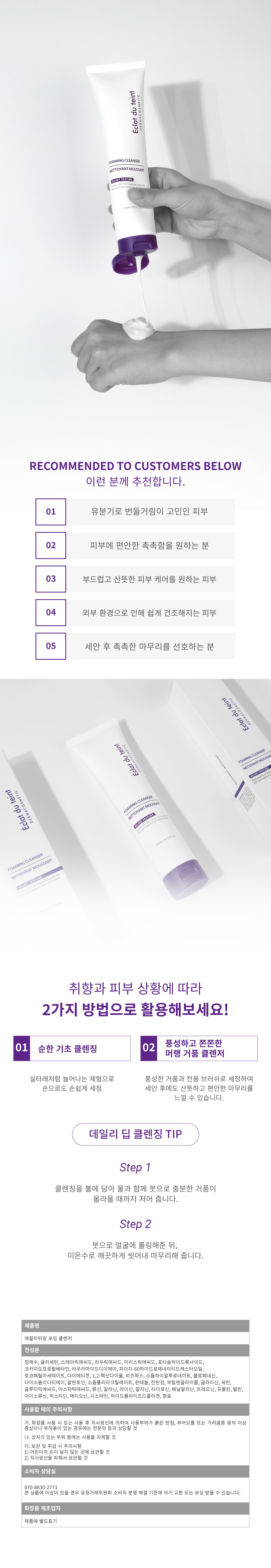 정제수, 글리세린, 스테아릭애씨드, 라우릭애씨드, 미리스틱애씨드, 포타슘하이드록사이드, 코카미도프로필베타인, 라우라마이드디이에이, 피이지-60하이드로제네이티드캐스터오일, 토코페릴아세테이트, 다이메티콘, 1,2-헥산다이올, 비즈왁스, 소듐하이알루로네이트, 클로페네신, 다이소듐이디티에이, 알란토인, 소듐폴리아크릴레이트, 판테놀, 잔탄검, 부틸렌글라이콜, 글라이신, 세린, 글루타믹애씨드, 아스파틱애씨드, 류신, 알라닌, 라이신, 알지닌, 타이로신, 페닐알라닌, 트레오닌, 프롤린, 발린, 아이소류신, 히스티딘, 메티오닌, 시스테인, 하이드롤라이즈드콜라겐, 향료