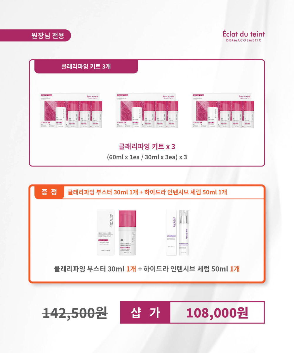 [클래리파잉 부스터] 정제수, 에탄올, 프로필렌글라이콜, 부틸렌글라이콜, 1,2-헥산다이올, 다이메틸설폰, 알로에베라잎수, 편백수, 글리세린, 설퍼콜로이드, 솔비탄세스퀴올리에이트, 알지닌, 카보머, 하이드록시에틸셀룰로오스, 베타인, 에틸헥실글리세린, 소듐아스코빌포스페이트, 폴리글리세릴-10라우레이트, 프로판다이올, 피리독신에이치씨엘, 부틸아보카데이트, 알란토인, 소듐하이알루로네이트, 다이소듐이디티에이, 악마의발톱뿌리추출물, 갈대추출물, 퉁퉁마디추출물, 모란뿌리추출물, 병풀잎추출물, 스타아니스추출물, 약모밀추출물, 연꽃꽃추출물, 자몽추출물, 카바카바뿌리추출물, 티트리잎오일, 황금추출물, 레몬추출물, 빌베리열매추출물, 사탕수수추출물, 설탕단풍추출물, 오렌지추출물, 다이소듐포스페이트, 인삼추출물, 폴리솔베이트60, 소듐포스페이트, 토코페롤