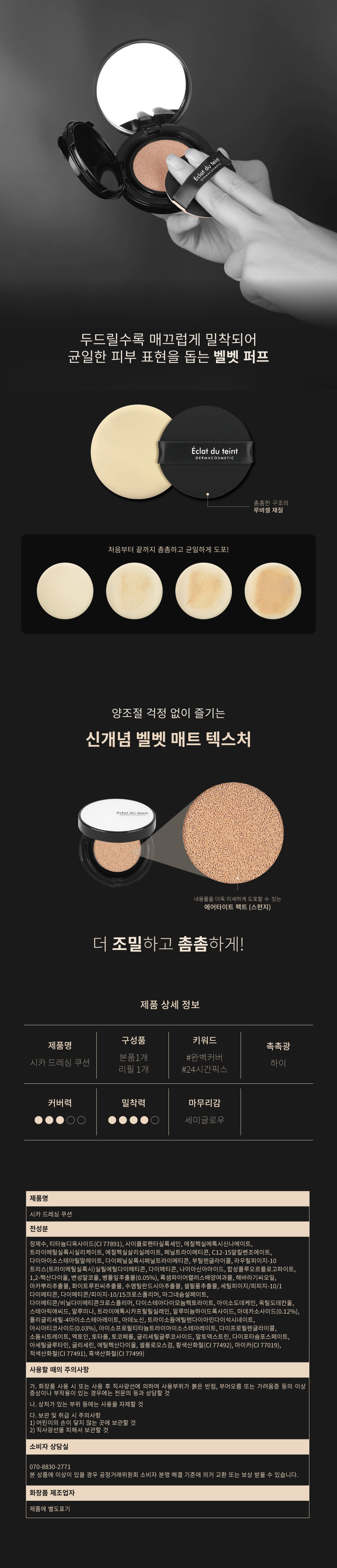 전성분 정제수, 티타늄디옥사이드(CI 77891), 사이클로펜타실록세인, 에칠헥실메톡시신나메이트, 트라이메틸실록시실리케이트, 에칠헥실살리실레이트, 페닐트라이메티콘, C12-15알킬벤조에이트, 다이아이소스테아릴말레이트, 다이페닐실록시페닐트라이메티콘, 부틸렌글라이콜, 라우릴피이지-10트리스(트라이메틸실록시)실릴에틸다이메티콘, 다이메티콘, 나이아신아마이드, 합성플루오르플로고파이트, 1,2-헥산다이올, 변성알코올, 병풀잎추출물(0.05%), 록샘파이어캘러스배양여과물, 해바라기씨오일, 마카뿌리추출물, 화이트루핀씨추출물, 수염틸란드시아추출물, 셀필룸추출물, 세틸피이지/피피지-10/1다이메티콘, 다이메티콘/피이지-10/15크로스폴리머, 마그네슘설페이트, 다이메티콘/비닐다이메티콘크로스폴리머, 다이스테아다이모늄헥토라이트, 아이소도데케인, 옥틸도데칸올, 스테아릭애씨드, 알루미나, 트라이에톡시카프릴릴실레인, 알루미늄하이드록사이드, 마데카소사이드(0.12%), 폴리글리세릴-4아이소스테아레이트, 아데노신, 트라이소듐에틸렌다이아민다이석시네이트, 아시아티코사이드(0.03%), 아이소프로필티타늄트라이아이소스테아레이트, 다이프로필렌글라이콜, 소듐시트레이트, 엑토인, 토타롤, 토코페롤, 글리세릴글루코사이드, 말토덱스트린, 다이포타슘포스페이트, 아세틸글루타민, 글리세린, 에틸헥산다이올, 셀룰로오스검, 황색산화철(CI 77492), 마이카(CI 77019), 적색산화철(CI 77491), 흑색산화철(CI 77499)