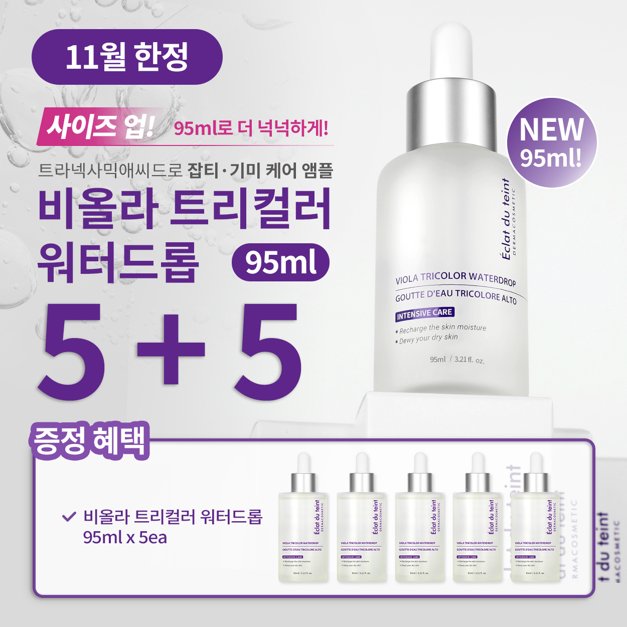 비올라트리컬러워터드롭 : 정제수, 부틸렌글라이콜, 나이아신아마이드, 글리세린, 1,2-헥산다이올, 트라넥사믹애씨드, 솔비탄세스퀴올리에이트, 클로페네신, 소듐하이알루로네이트, 에틸헥실글리세린, 글루코노락톤, 하이드록시에틸셀룰로오스, 폴리글리세릴-10라우레이트, 프로판다이올, 카보머, 알지닌, 아데노신, 포도주추출물, 하이드롤라이즈드삼색제비꽃추출물, 낫토검, 병풀추출물, 감초뿌리추출물, 스타아니스추출물, 자몽추출물, 연꽃꽃추출물, 모란뿌리추출물, 황금추출물, 카프릴릴글라이콜, 접시꽃추출물, 알로에베라잎추출물, 다이소듐포스페이트, 폴리솔베이트60, 쇠비름추출물, 소듐포스페이트, 인삼추출물, 녹차추출물
