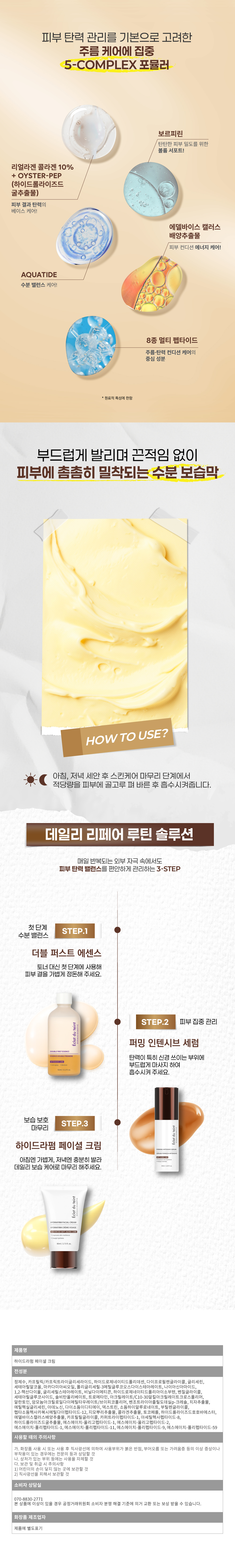 정제수, 사이클로펜타실록세인, 사이클로헥사실록세인, 글리세린, 글라이신, 세린, 글루타믹애씨드, 아스파틱애씨드, 류신, 알라닌, 라이신, 알지닌, 타이로신, 페닐알라닌, 트레오닌, 프롤린, 발린, 아이소류신, 히스티딘, 메티오닌, 시스테인, 부틸렌글라이콜, 올리브오일, 세틸피이지/피피지-10/1다이메티콘, 에칠헥실메톡시신나메이트, 카프릴릭/카프릭트라이글리세라이드시어버터, 1,2-헥산다이올, 세틸알코올, 비즈왁스, 솔비탄세스퀴올리에이트, 소듐클로라이드, 티타늄디옥사이드, 알루미늄하이드록사이드 , 스테아릭애씨드, 다이메치콘, 칸디다봄비콜라/글루코오스/메틸레이프씨데이트발효물, 쌀배아오일, 코코넛야자오일, 피이지-100스테아레이트, 글리세릴스테아레이트, 스테아레스-21, 스테아레스-2, 프로필렌글라이콜, 레시틴, 폴리솔베이트60, 클로페네신, 토코페릴아세테이트, 알란토인, 잔탄검, 나이아신아마이드, 카라멜, 마트리카리아꽃추출물, 베르가못잎추출물, 오레가노잎추출물, 애플민트잎추출물, 살비아잎추출물, 스피어민트잎추출물, 티트리잎추출물, 페퍼민트잎추출물, 라벤더꽃추출물, 와일드제라늄추출물, 류코노스톡/무발효여과물, 소듐하이알루로네이트, 글루타티온, 하이드롤라이즈드하이알루로닉애씨드, 소듐아세틸레이티드하이알루로네이트, 펜틸렌글라이콜, 마데카소사이드, 판테놀, 세라마이드엔피, 하이드로제네이티드레시틴, 콜레스테롤, 아세틸헥사펩타이드-8, 카퍼트라이펩타이드-1, 팔미토일펜타펩타이드-4, 트라이펩타이드-1, 팔미토일트라이펩타이드-1, 헥사펩타이드-9, 노나펩타이드-1, 에틸헥실글리세린, 다이소듐이디티에이, 로즈마리잎오일, 리모넨